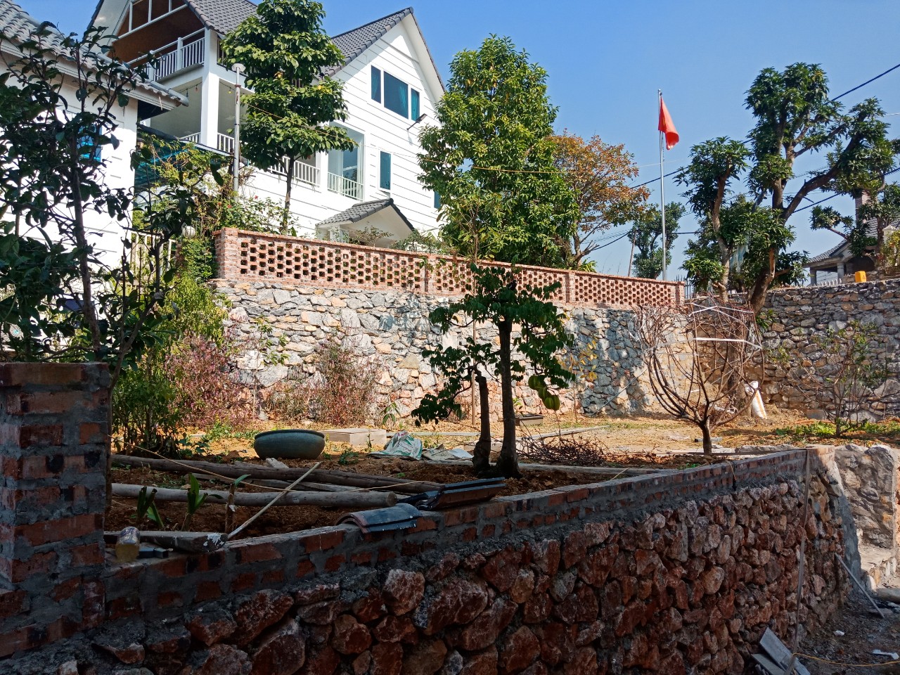 - Phần kè đá các cốt sân vườn được thi công bằng đá đỏ, khác với màu đá của các cốt kè