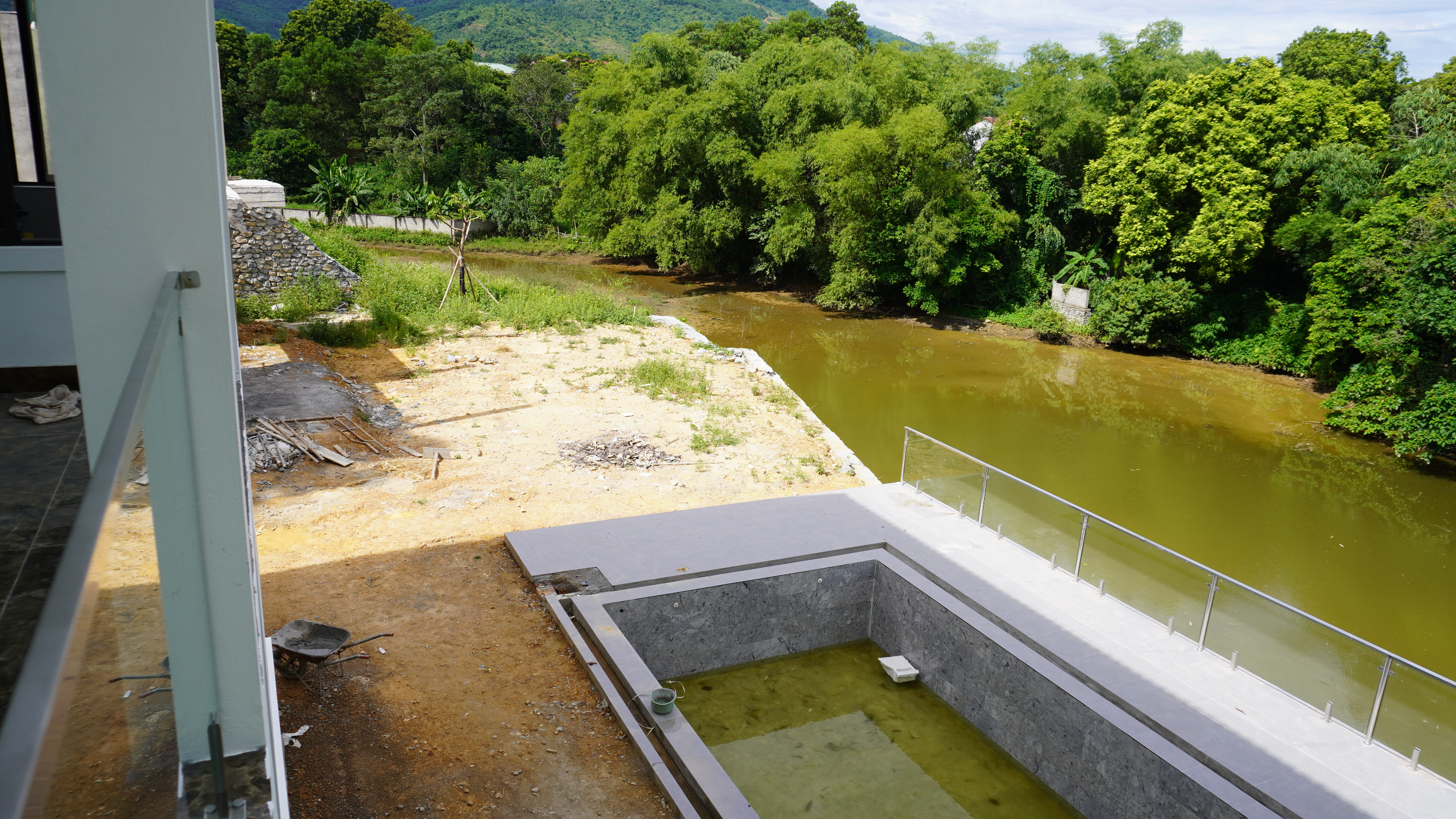 - Khuôn viên biệt thự ở bám suối, chủ nhà tận dụng tầm view này làm vách ngăn từ bể bơi nhìn ra ngoài