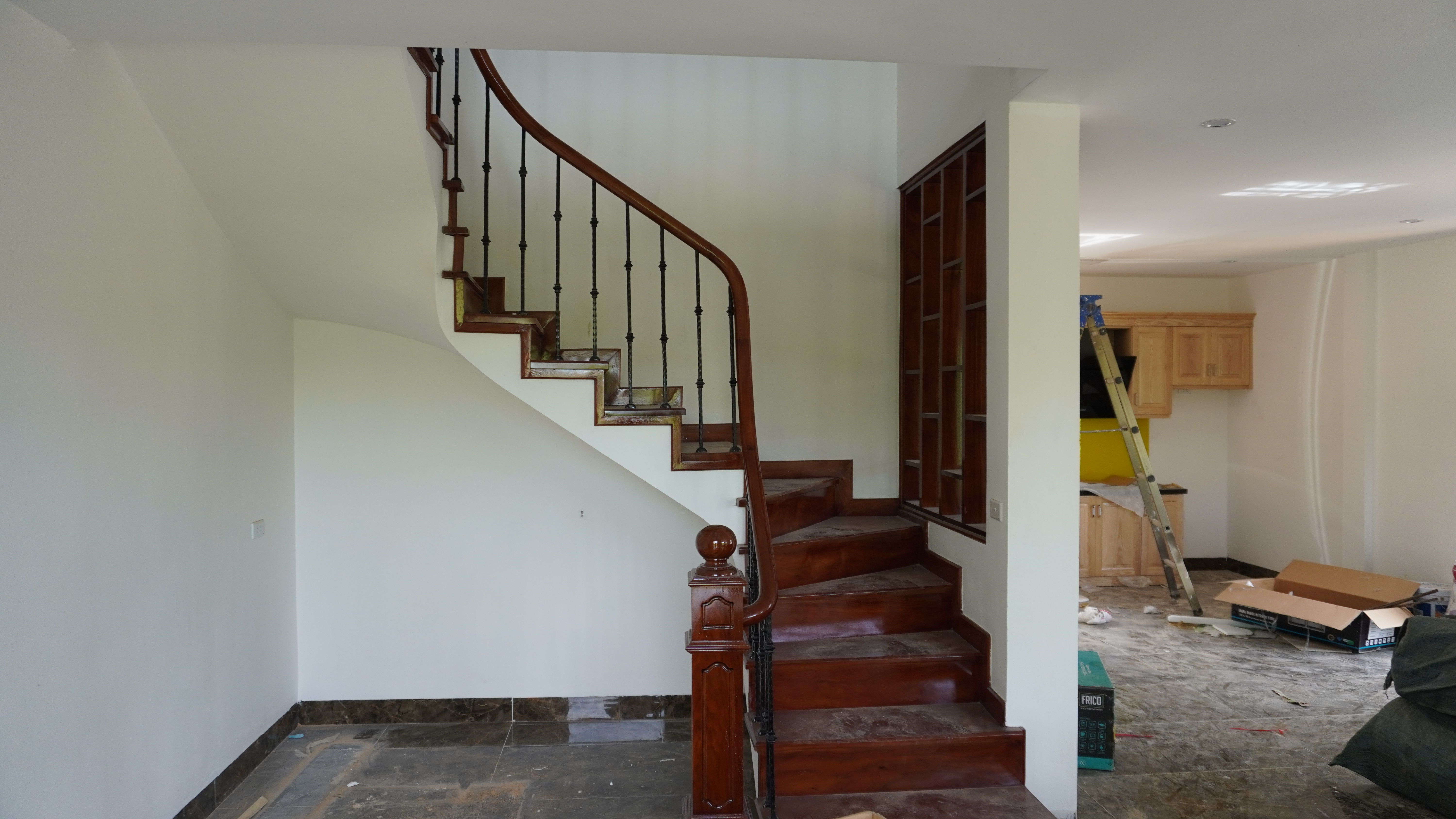 - Cầu thang trong nhà được ốp gỗ, tạo độ sang trọng, sạch sẽ, gọn gàng cho ngôi biệt thự.